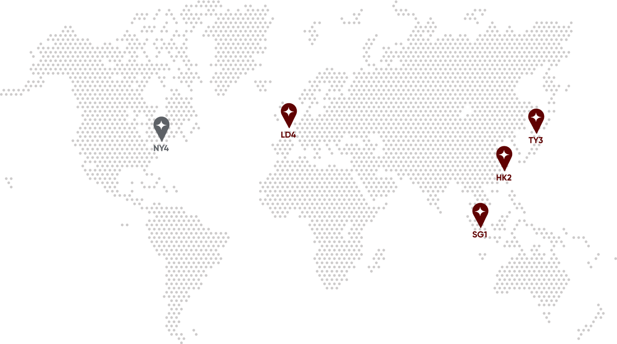 Nuestros servidores dedicados, ubicados en Londres (LD4), Nueva York (NY4), Singapur (SG1), Tokio (TY3) y Hong Kong (HK2), están conectados a través de líneas dedicadas ultrarrápidas. Ofrecen una agregación de baja latencia, enrutamiento inteligente de órdenes y motores de optimización de cotizaciones, creando un ecosistema financiero global de alta velocidad.