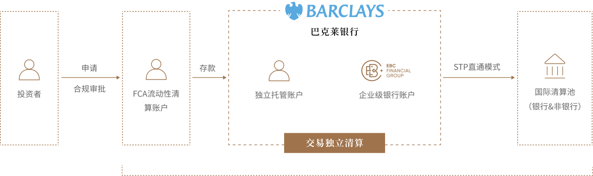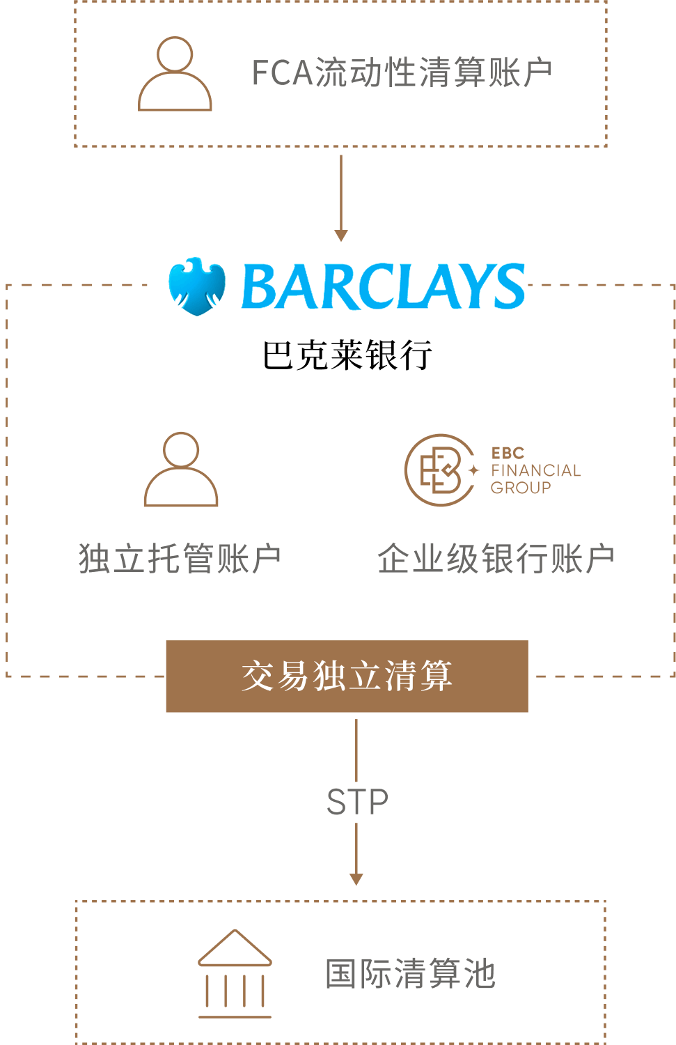 根据FCA法规,EBC Financial Group Limited 仅接受专业投资者和机构投资者,可开设杠杆为100倍的FCA流动性清算账户,投资者资金将独立托管于巴克莱银行隔离账户。